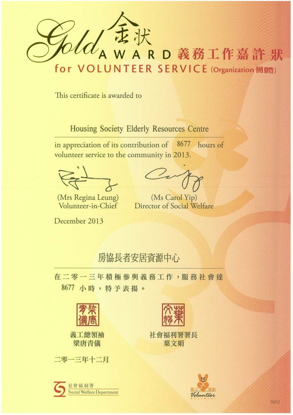 2014-05-01 房协长者安居资源中心获颁「义工服务团体」金奖 收藏 房协长者安居资源中心获颁「义工服务团体」金奖,以表扬中心义工在2013年积极参与义工服务工作,服务社会达8,677小时。今年已是中心第八年获此殊荣。义工运动由社会福利署主办,截至2013年底,共有2,507间机构会员。