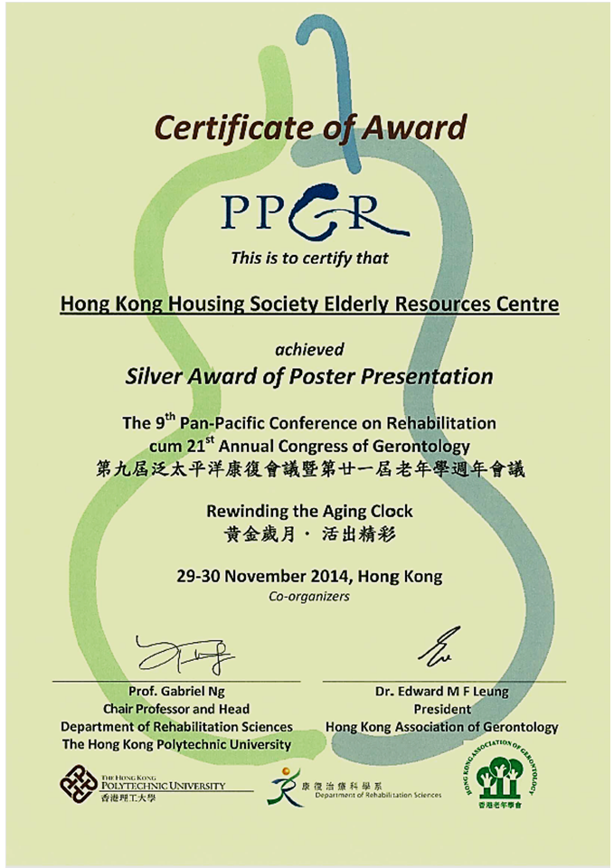 2015-01-01 房协长者安居资源中心获颁论文发表银奖 收藏 在第九届泛太平洋康复会议暨第廿一届老年学周年会议上,房协长者安居资源中心获颁论文发表银奖。论文的题目为「发展互动身体功能评估以在香港基层医疗层面推广健康耆年」。会议于2014年11月29-30日举行,共有69份论文角逐奖项。