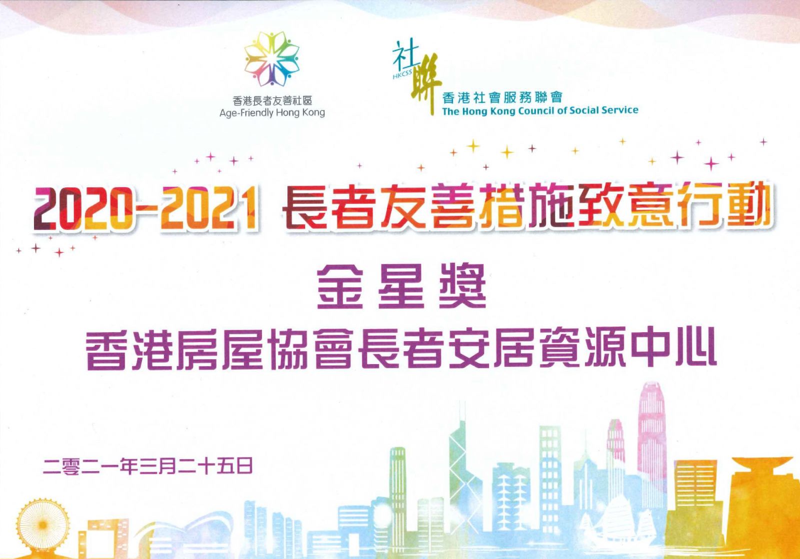 ERC was presented with "Golden Star Award", the highest honour in the Age-Friendly Appreciation Scheme 2020-2021, for its commitment to and outstanding performance in promoting "Age-friendly City" message and caring for the elderly. The Scheme is organized by HKCSS.