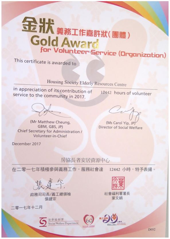 ERC won the Gold Award for Volunteer Service (Organization) for 13 years in a row, and Award of 10,000 hours for Volunteer Service for the second time, for its contribution of over 12,000 hours of volunteer service to the community in 2017.