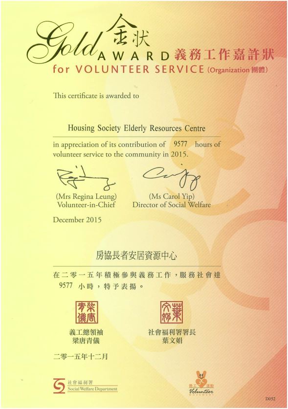 房协长者安居资源中心今年连续第十一年,获社署颁发「义工服务团体」金奖。去年中心义工积极参与义工服务,服务时数超过9,577小时。