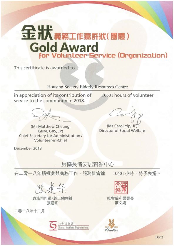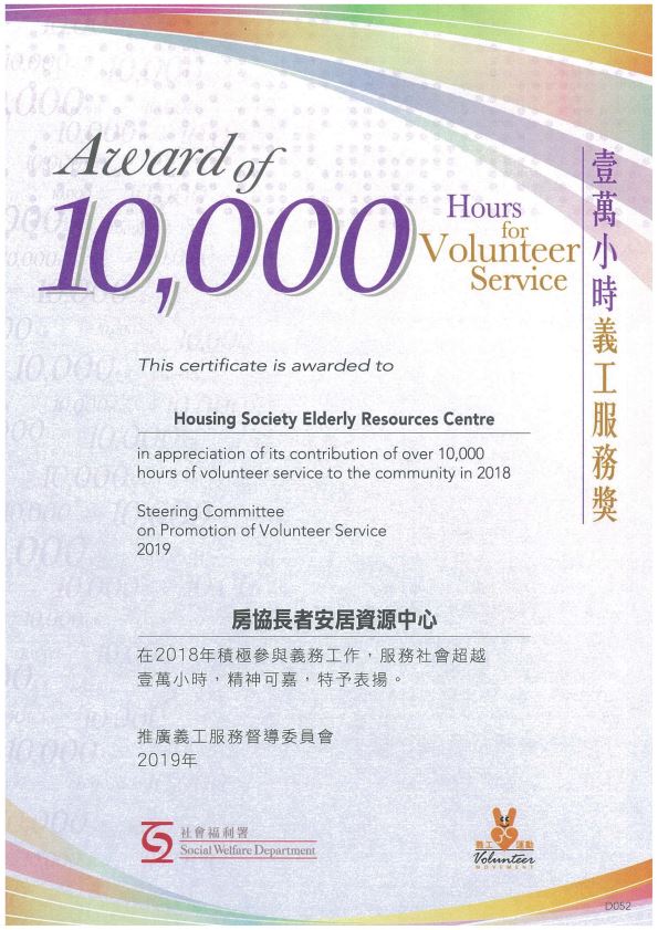 ERC won the Gold Award for Volunteer Service (Organization) for 14 years in a row, and Award of 10,000 hours for Volunteer Service for the third time, for its contribution of over 10,000 hours of volunteer service to the community in 2018.