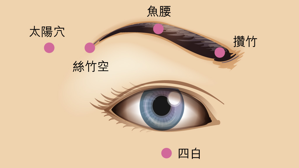 - 亦可點按穴位以作按摩:用兩食指指腹點按絲竹空、魚腰、攢竹、四白、太陽穴,手法由輕到重,這有健目明目及治療目疾的作用。