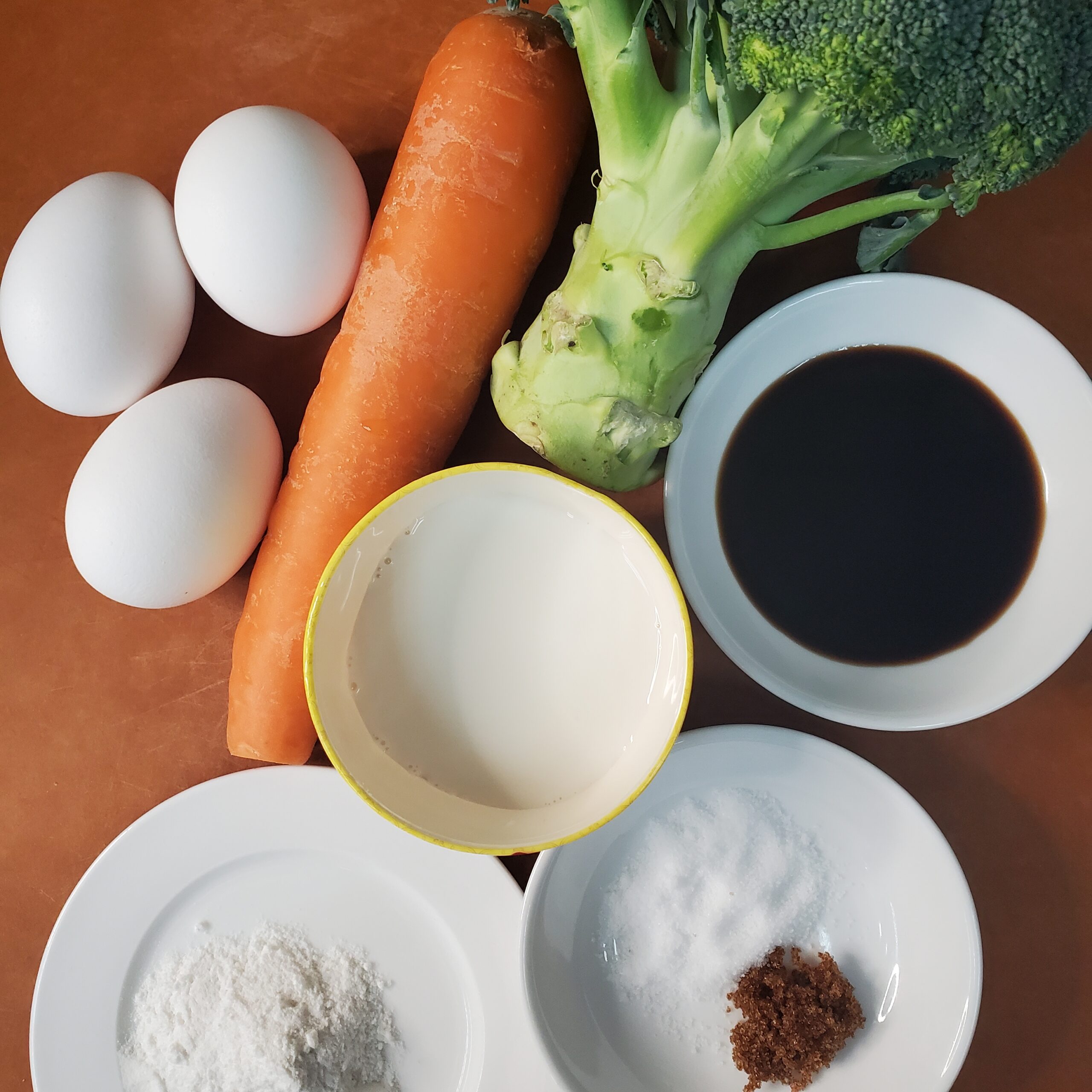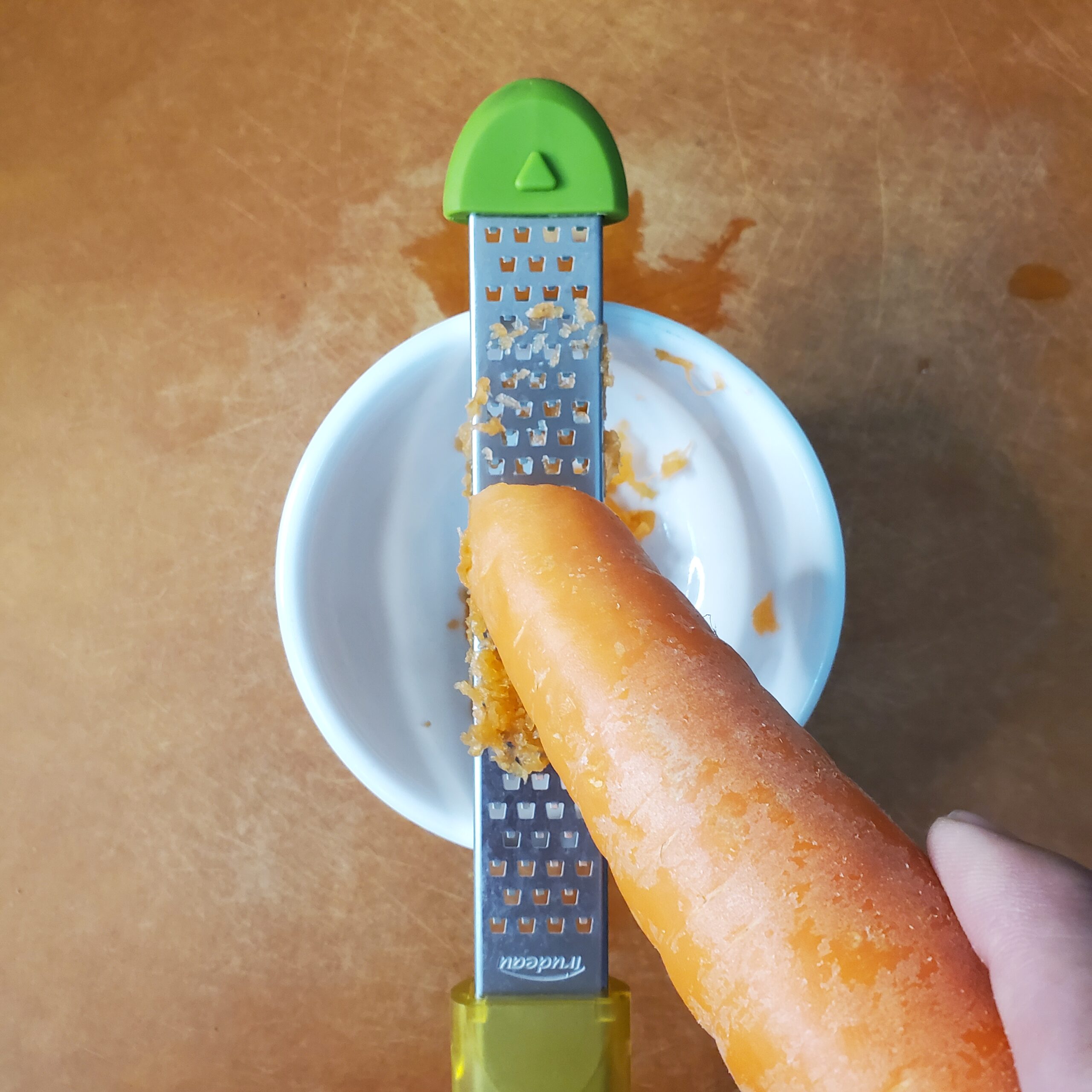 - 將西蘭花切成小棵,放在鹽水浸15-30分鐘,再以清水洗淨,瀝乾後用刀剁碎或用攪拌器攪碎,甘筍磨蓉或用攪拌器攪蓉,備用。