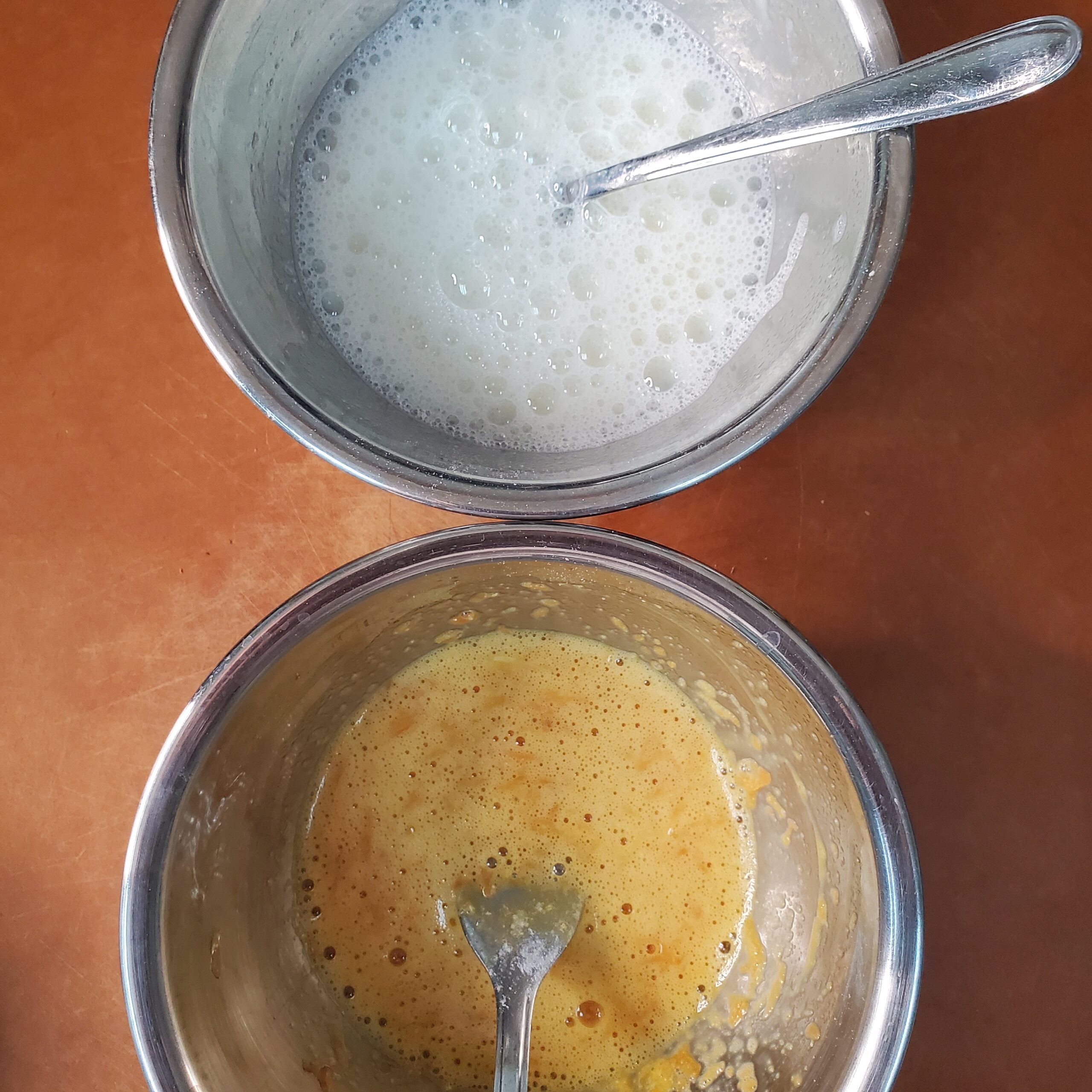 - 打勻蛋白,然後慢慢倒入牛奶拌勻,最後加入少許鹽、粟粉再拌勻。