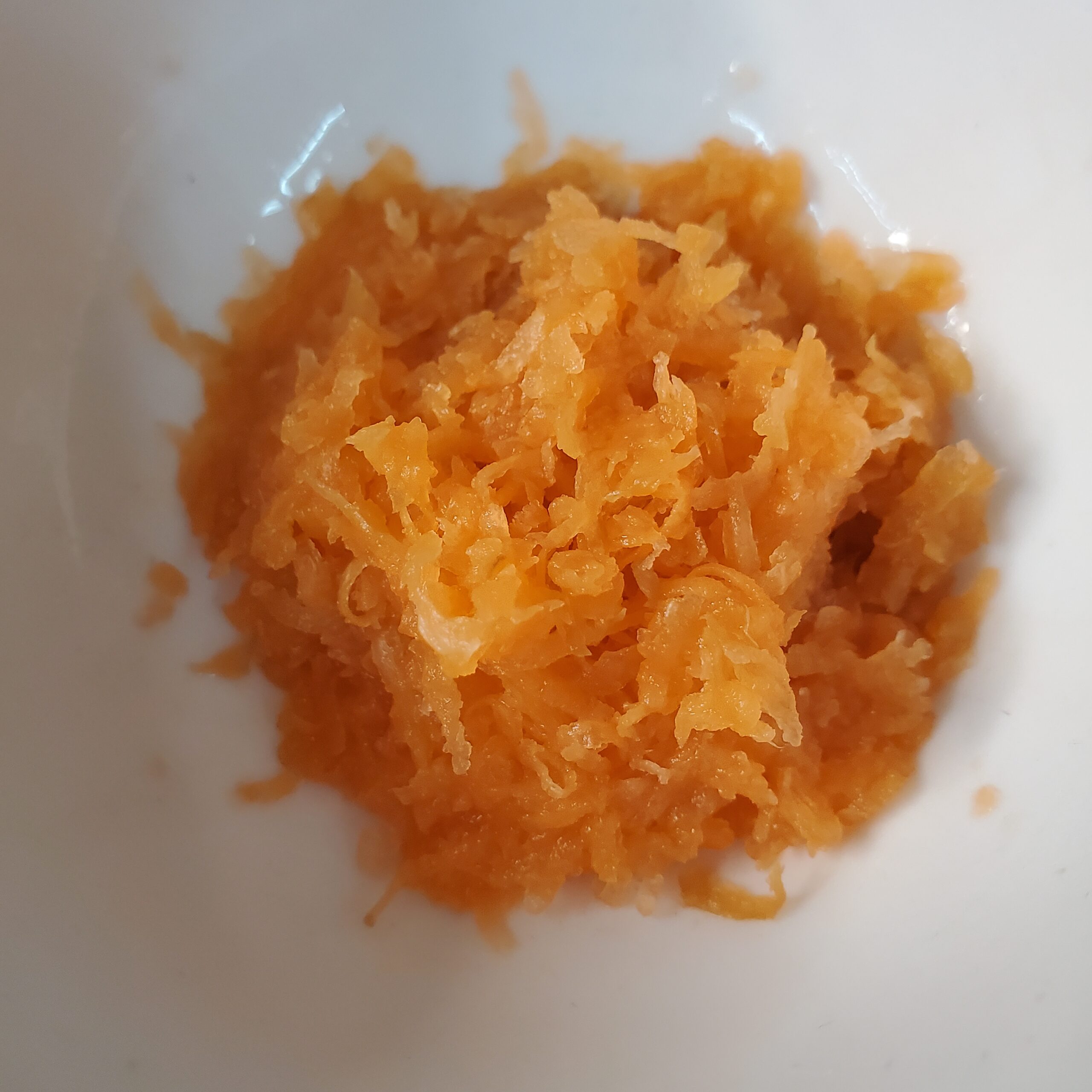 - 打勻蛋黃,然後慢慢倒入甘筍蓉拌勻,最後加入少許鹽、粟粉再拌勻。