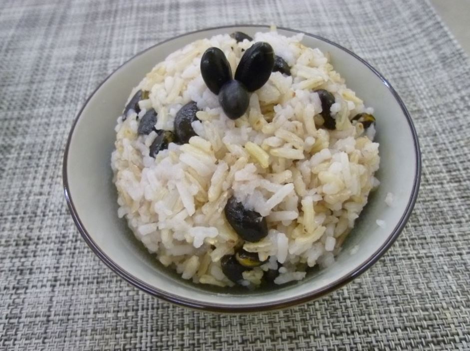 將白米、已浸泡的黑豆和糙米混合,放電飯煲內加水同煮,即成。