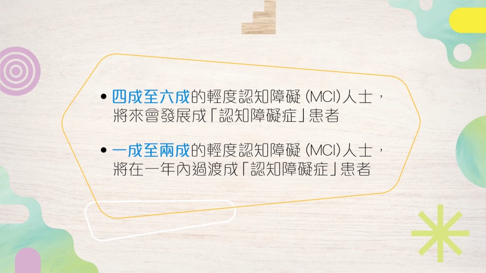 在長者正式確診患有認知障礙症之前,他們往往會有一個過渡期,稱為「輕度認知障礙(MCI)」。在這個階段,他們依舊能夠自行處理不同的日常事務,如搭車外出、買餸、煮飯等;可是若跟其他同年齡人士比較,記性會差了,即使他們自己都會察覺得到這個問題。
