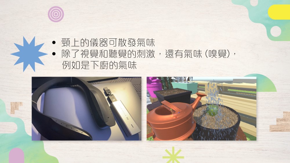 除了較普遍的視覺和聽覺感官刺激外,「多感官治療」亦包括了氣味的元素(嗅覺)。透過掛在頸上的儀器,可散發出氣味,例如是下廚的味道,讓人覺得特別「醒神」!此外,訓練項目中還有需要做動作的部分,例如淋花,那是觸覺方面的訓練,需要以手部去接觸。