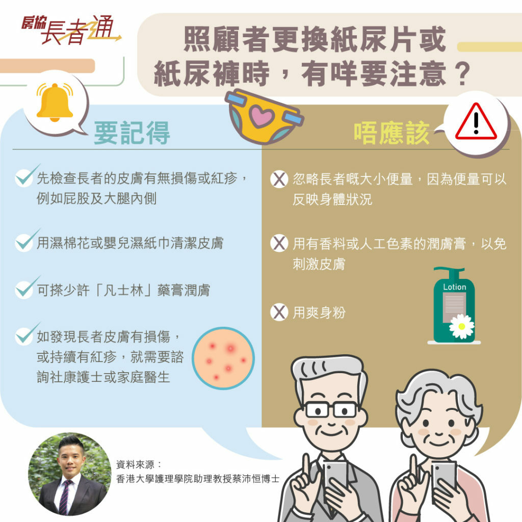 更換紙尿片/尿褲時,照顧者應先檢查長者的皮膚有無損傷或紅疹,如屁股或大腿內側,然後再用濕棉花或嬰兒濕紙巾清潔皮膚,並可搽少許「凡士林」藥膏潤膚。切記不要使用有香料或人工色素的潤膚膏,以免刺激皮膚,亦不建議使用爽身粉。