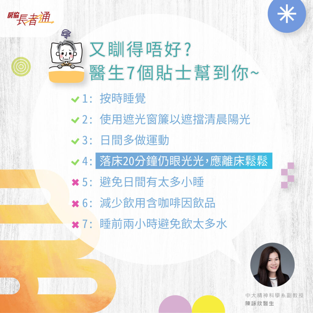 不少长者受到失眠问题困扰,难以入睡、容易醒、甚至彻夜难眠,都是普遍的情况,这样长远会影响身心健康。房协长者通特意邀请中大精神科学系副教授陈咏欣医生,为大家讲解长者睡眠障碍主因,以及认知行为治疗如何改善失眠。