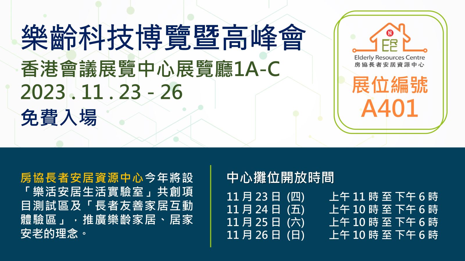 樂齡科技博覽暨高峰會將於11月23-26日舉行,房協長者安居資源中心攤位(編號:A401)將設「樂活安居生活實驗室」共創項目測試區及「長者友善家居互動體驗區」,推廣樂齡家居、居家安老的理念。展覽免費入場,歡迎參觀。
