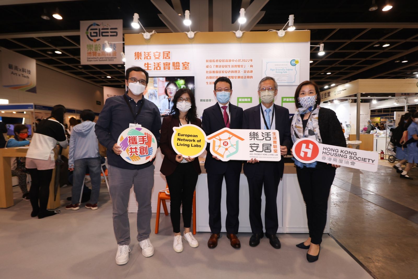 5. 房協主席陳家樂先生 SBS, JP (右二)、房協行政總裁兼執行總幹事陳欽勉先生(中)、企業傳訊總監梁綺蓮(右)、房協總經理(長者服務)吳家雯博士(左二)及房協經理(長者服務)施品正(左)為我們打打氣!