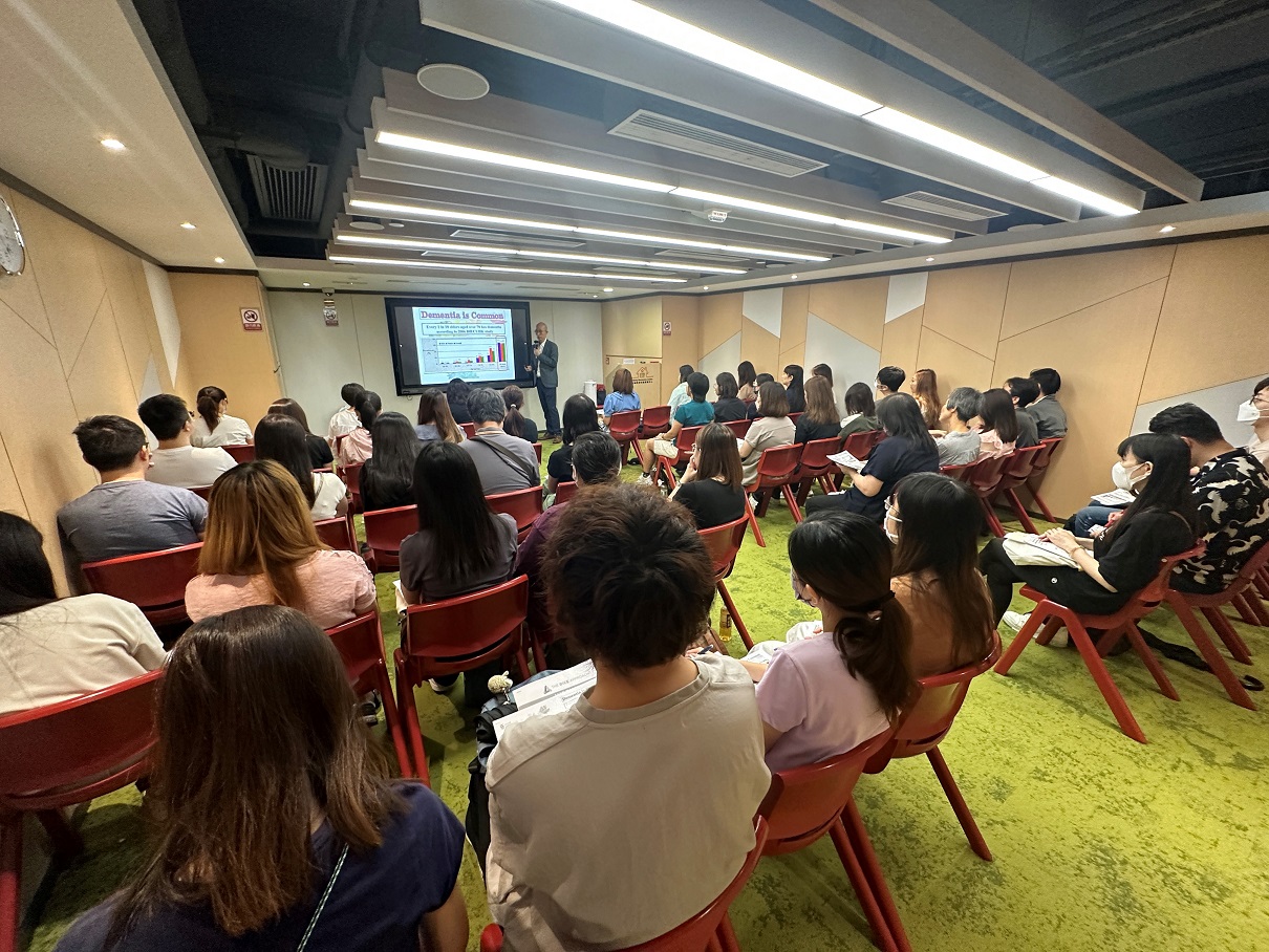 2023-08-11 「長者友善家居」專業訓練工作坊 收藏 1. 內科及老人科醫生陳鎮中向參加者講解認知障礙症患者的成因、徵狀以及相關行為問題的處理方法。2. 註冊職業治療師莊淑怡分享處理認知障礙症行為問題的應對技巧及個案分享。3. 中心一級職業治療師葉靈進分享「智友善」家居探知館的背後理念、設計原則與應用。